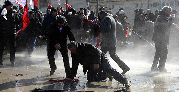 Jandarma, bariyerleri aşarak duruşma salonuna girmek isteyen gruba tazyikli su ile müdahale etti.