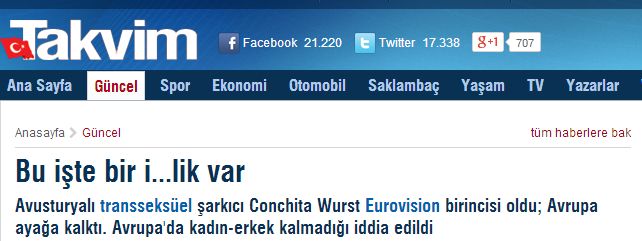 Tepkiler sadece Rusya, Ukrayna, Belarus ve Ermenistan'dan gelmedi tabii. Çok sayıda LGBTİ de Conchita'yı eleştiren şeyler yazdılar. Ona maskara diyen de oldu böyle bizleri rezil ediyor diyen de. Kadın mı erkek mi belli değil diye onu aşağılayan transların yorumları ya da bu toplum bu gibiler yüzünden bize saygı göstermiyor diye feryat eden gey... Conchita sadece heteroseksüellerin değil birçok sayıları az olsa da LGBTİ'lerin de nefretine maruz kaldı.