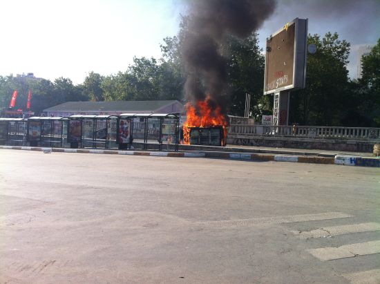 18:40 Taksim'de devrilen arabalardan biri alev aldı.