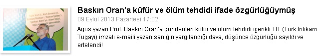 Bilal Şekerlisoy adlı kişi tarafından 2010 yılında Türk İntikam Tugayı (TİT) örgütü imzasıyla Baskın Oran hedef alınarak gazetemiz Agos’a e-mail yoluyla gönderilen açık tehdidin cezalandırılması istenmişti. Bu kapsamda başlatılan hukuki süreçte, Ankara, Adana ve İstanbul’da beş ayrı mahkeme gezilmişti. Davanın son olarak gönderildiği Ankara 12. Asliye Ceza Mahkemesi, geçen Temmuz ayında dosyanın esasına girmeden, sanığın sözlerini ‘düşünce açıklaması’ olarak nitelemişti. Mahkeme bu görüşle davayı, basın yayın yoluyla işlenen suçlarla ilgili soruşturma ve davaların ertelenmesini öngören 3. Yargı Paketi kapsamına sokarak ertelemişti.