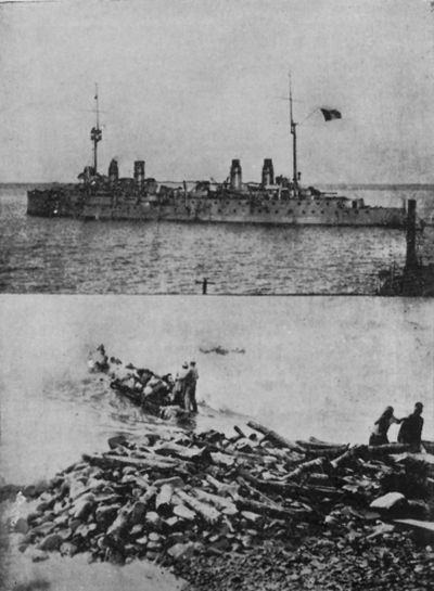 Musa Dağlıları iki günlük bir yoculuğun ardından Port Said’e götüren Fransız kruvazörlerden biri ve kıyıdan gemiye ulaşmak için kullanılan sal. (OCC Koleksiyonu) |