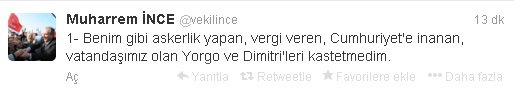 Kendisinin de Yorgo ve Dimitri adlı arkadaşları olabileceğini belirten Muharrem İnce, @vekilince adlı kişisel Twitter hesabından attığı iki twette şunları yazdı: “Benim gibi askerlik yapan, vergi veren, Cumhuriyet’e inanan, vatandaşımız olan Yorgo ve Dimitri’leri kastetmedim. Benim kastettiğim 1919’larda bu toprakları işgale gelen Yorgo’lardır, Dimitri’lerdir, Edward’lardır. konuyu kimse çarpıtmasın, saptırmasın.”