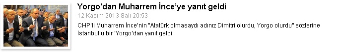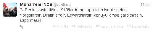 Agos.com.tr - CHP Grup Başkanvekili Muharrem İnce, Agos’un haberi üzerine Twitter’dan yaptığı açıklamada, Türkiye vatandaşı olan değil, bu toprakları işgale gelen ‘Yorgo’ları ve ‘Dimitri’leri kastettiğini açıkladı.