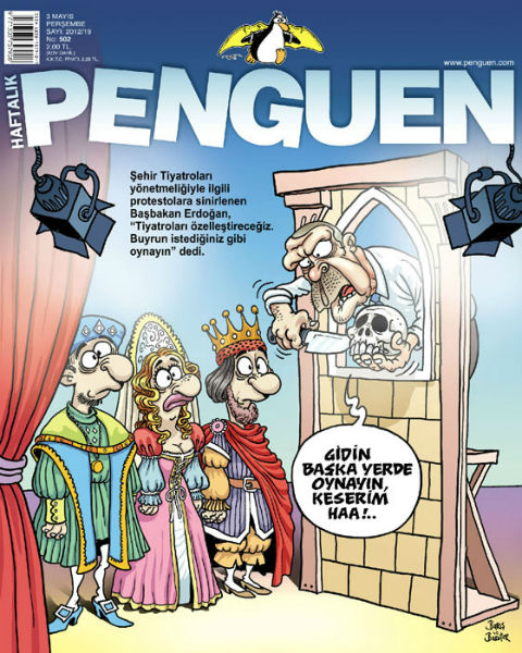 Haftalık mizah dergisi Penguen, Şehir Tiyatroları'ndaki yönetmelik değişikliğine gelen tepkiler üzerine 'Tiyatroları özelleştireceğiz, Buyrun istediğiniz gibi oynayın' diye karşılık veren Başbakan Tayyip Erdoğan'ı kapak yaptı.