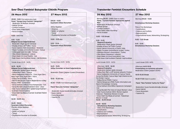 İki gün sürecek buluşmada, Türkiyeli ve Türkiye dışından gelecek katılımcıların bölgesel barışçıl feminist politikaları, feminist hareketin kendi bölgelerindeki gündemlerini aktaracağı oturumların ardından düzenlenecek atölyeler; anayasa, temsil, şiddet ve çatışma, örgütlenme sorunları ve stratejiler üst başlığında yapılacak.