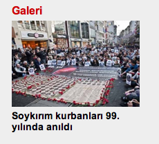 Ermeni Soykırımı’nın 99. yıldönümünde, 24 Nisan Ermeni Soykırımını Anma Platformu, saat 19.15’te Taksim’de anma düzenledi. Daha önceki yıllarda Taksim Meydanı’nda yapılan anma bu yıl Valiliğin yasak kararından dolayı İstiklal Caddesi üzerinde bulunan Fransız Konsolosluğu önünde yapıldı.