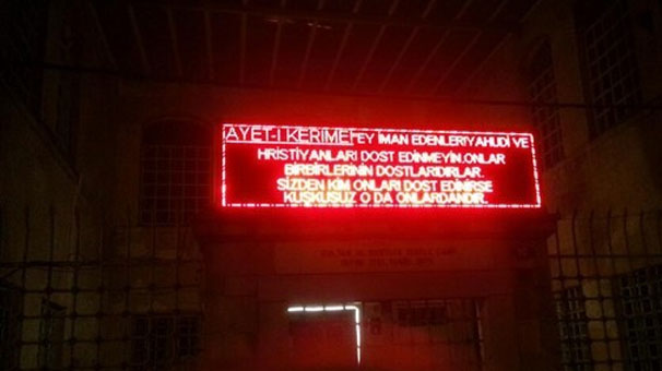 Kadıköy İskele Camii’nin elektronik panosunda Noel gecesi ‘Hıristiyanlarla dost olmayın’ mesajı veren ayeti Diyanet Başkanlığı Din İşleri Yüksek Kurulu’na da sorduk. “Din hürriyeti vardır, biri bir dine mensup diye, ona göre yaşıyor diye kimse onu cezalandırma yetkisine sahip değil” diyen Diyanet yetkilisi, “İslam din ve düşünce hürriyetinden yanadır. Caminin panosuna yazılan ayet özel bir amaç taşımamaktadır, konjonktür gereği yanlış anlaşılmış olabilir” dedi.