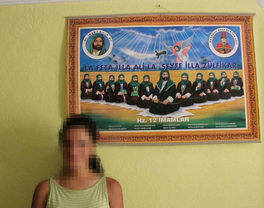 Dersim’deki bir Ermeni kadın, On İki İmam’ın resminin olduğu evinde. Ermeni olduğunu 15 yaşında öğrenmiş. Yabancılar için o Alevi Zaza, fakat Dersim’deki arkadaşları ve komşuları, onun Ermeni ve Hıristiyan olduğunu biliyor. Dersim’de Ermeni olarak bilinmekten korkmadığını söylüyor, “fakat eğer üniversitede öğrenilirse, hayatımdan endişe ederim” diyor. Bir üniversitede İktisat öğrenimi görüyor. /