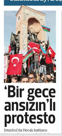 Ermenilerin Hocalı kasabasında yaptıkları katliamın 20. Yıldönümü anısına Taksim'de yapıldığı söylenen protesto yürüyüşüyle ilgili; “milletvekilleri, Azeri sanatçılar ve çok sayıda dernek ile sivil toplum örgütü katılırken halk da destek verdi” dendi.