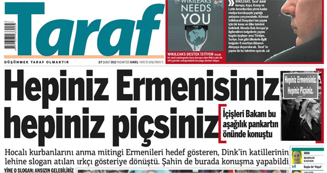 Yukarıdaki ırkçı sloganı manşetine taşıyan Taraf’ın haberinde özetle şu bilgiler yer aldı: “Hocalı katliamının 20. yılında İstanbul Taksim Meydanı’nda düzenlenen protesto mitingi Ermenileri hedef gösteren, Dink'in katillerinin lehine slogan atılan ırkçı gösteriye dönüştü.”
