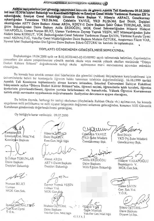 2000 tarihli bir belge ise Heybeliada Ruhban Okulu’nun geleceğine dair tutumu ortaya koyan somut bir kanıt örneği olarak 2009’da okulun yeniden açılma tartışmaları sırasında ortaya çıkıyordu. Milliyet gazetesinin ortaya çıkardığı belge 1962’de “Gizli Kararname” ile kurulan ve bünyesinde İçişleri ve Dışişleri bakanlıkları, polis, MİT, Genelkurmay ve MGK temsilcilerini bulunduran Azınlıklar Tali Komisyonu’nun imzasını taşıyordu.
