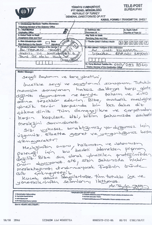 Çağdaş Hukukçular Derneği (ÇHD) İstanbul Şube Başkanı Taylan Tanay'ın, Kocasakal'a gönderdiği mektubunda, 'sizi uykusuz bıraktığımız, yorduğumuz için üzgünüz. Elbette gayret ve yorgunluğunuz boşa çıkmayacaktır' ifadesi yer aldı.
