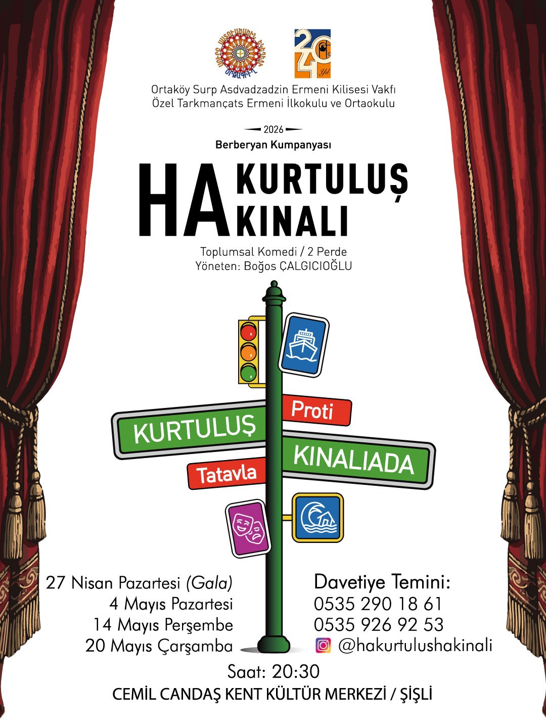 Ortaköy Ermeni Meryemana Surp Astvazazin Kilisesi ve Tarkmanças ile Hripsimyans Mektepleri ve Ermeni Mezarlığı Vakfı tarafından tekrar bir araya gelmeleri için desteklenen ekip, oyunun provalarını Karagözyan Ermeni Yetimhanesi Vakfı bünyesinde gerçekleştirdi. Oyun aynı zamanda Ortaköy Tarmançats Okulu’nun 240.yıl kutlama etkinlikleri kapsamında da galasını gerçekleştiriyor. Kumpanya, bünyesindeki tecrübeli oyunculara yeni ve genç oyuncuları da katarak, hem oyunun güncel metnini hem de prodüksiyonu hazırladı. Oyunun ilk bölümünde Kurtuluş semtinde bir tam gün içinde evde geçen bir yılbaşı yemeği hazırlığı ve yeni yıl kutlamaları canlandırılıyor. Bu süreçte, Kurtuluş semtine, semt sakinlerine ve alışkanlıklarına yer verilirken, toplumsal olaylara da değiniliyor. İkinci bölümde ise karakterlerin, bu kez Kınalıada’da geçen yaklaşık 2 aylık süreçlerine tanıklık ediliyor. Prens Adaları’nın tamamında gerçekleşmesi planlanan kurgusal dernek seçimlerinin Kınalıada ayağında; kahramanların başına gelenler, olağan ada yaşamı ve yine toplumsal olaylara odaklanılıyor.