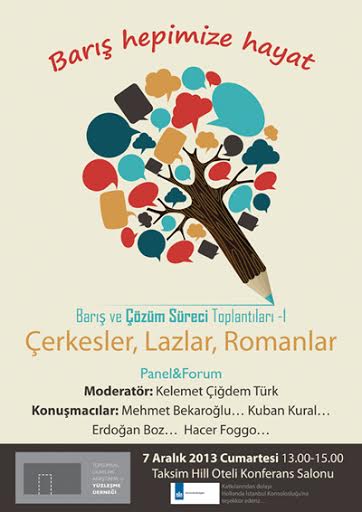 Yüzleşme Derneği’nin ‘Barış Hepimize Hayat’ şiarıyla düzenlediği panel&forumların ilki yarın (7 Aralık 2013) saat 13.00-15.00 arasında Taksim Hill Oteli konferans salonunda yapılacak. İlk panel&forumda Çerkesler, Lazlar ve Romanlar açısından süreç değerlendirilecek.