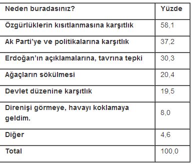 Parkta bulunma sebebi, yüzde 58 oranında “özgürlüklerin kısıtlanmasına karşıtlık.” Bunu yüzde 37 ile Ak Parti’ye ve politikalarına karşıtlık ve yüzde 30 ile Erdoğan’ın açıklamalarına, tavrına tepki takip ediyor.