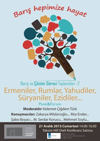Agos.com.tr - Toplumsal Olayları Araştırma ve Yüzleşme Derneği’nin ‘Barış Hepimize Hayat’ şiarıyla düzenlediği panel&forumların ikincisi yarın Taksim Hill Oteli konferans salonunda yapılacak. Panel&forumda Ermeniler, Rumlar, Yahudiler, Süryaniler, Ezidiler açısından barış süreci değerlendirilecek.