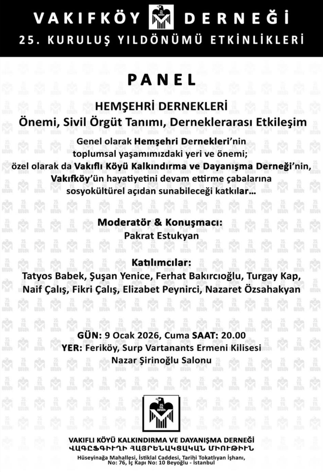 Հայրենակցական միութիւնները ներկայացնելու գծով ճշդուած անուններ եղան Թադէոս Պեպեք, Ֆիքրի Չալըշ, Շուշան Եէնիճէ, Ֆերհատ Պաքըրճըօղլու, Թուրկայ Քափ, Նաիֆ Չալըշ, Էլիզապեթ Փէյնիրճի եւ Նազարէթ Էօզսահակեան։