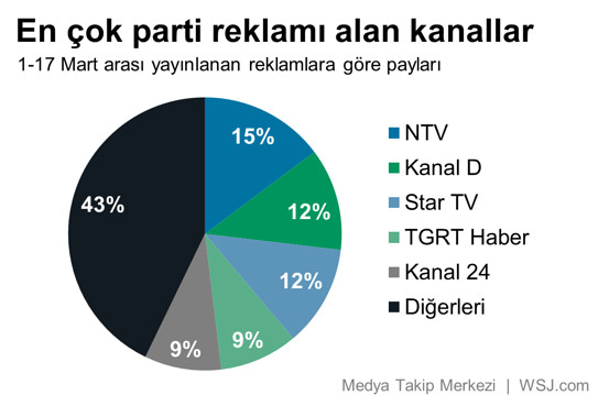 Türkiye 30 Mart yerel seçimlerine hazırlanırken, partiler de projelerini anlatmak için reklam ve tanıtım faaliyetlerini artırdı. Medya Takip Merkezi’nin The Wall Street Journal Türkiye için derlediği bilgilere göre siyasi partiler için sadece Mart ayında 13 ulusal kanala 2 bin 508 adet reklam yayımlattı. 17 günde yayımlanan parti reklamlarının toplam süresi 27 saati buldu. En fazla reklam veren parti AKP, alan kanal da NTV oldu.