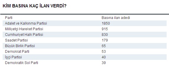 Yazılı basında yayımlanan reklamlara bakıldığındaysa partilerin bu mecralarda Mart ayında 4 bin 33 ilan yayımlatmış olması göze çarpıyor. Birincilik Ege’nin yerel gazetesi Yeni Asır, Hürriyet ve Zaman gazetelerinde. Bu 3 gazete de 17 günde 22 adet siyasi parti reklamı yayımlamış görünüyor. Basın ilanlarında da birincilik TV reklamlarında olduğu gibi bin 850 ilanla AKP’nin. İkinci olan ise, 915 ilan adediyle MHP görünüyor. CHP 830 adet ilan yayımlatarak üçüncü sırada yer alıyor.