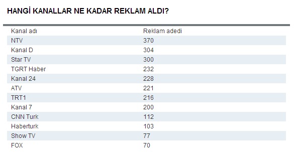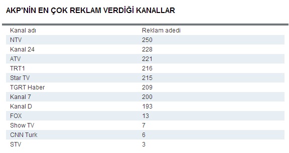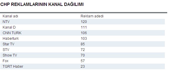 CHP bu seçim çalışmaları için reklamlarını yayımlatmak üzere 8 kanala ilan vermiş. AKP’de ise kanal sayısı 11. CHP’nin 17 günde en fazla reklam verdiği 5 kanaldaki reklam adedi hep 100’ün üzerinde. AKP ise en fazla reklam yayımlattığı 6 kanalın her birinde en az 200 kez reklamlarıyla boy göstermiş. CHP’nin ilk 5’inde NTV’nin ardından Kanal D, CNN Türk, Habertürk ve Star TV geliyor.