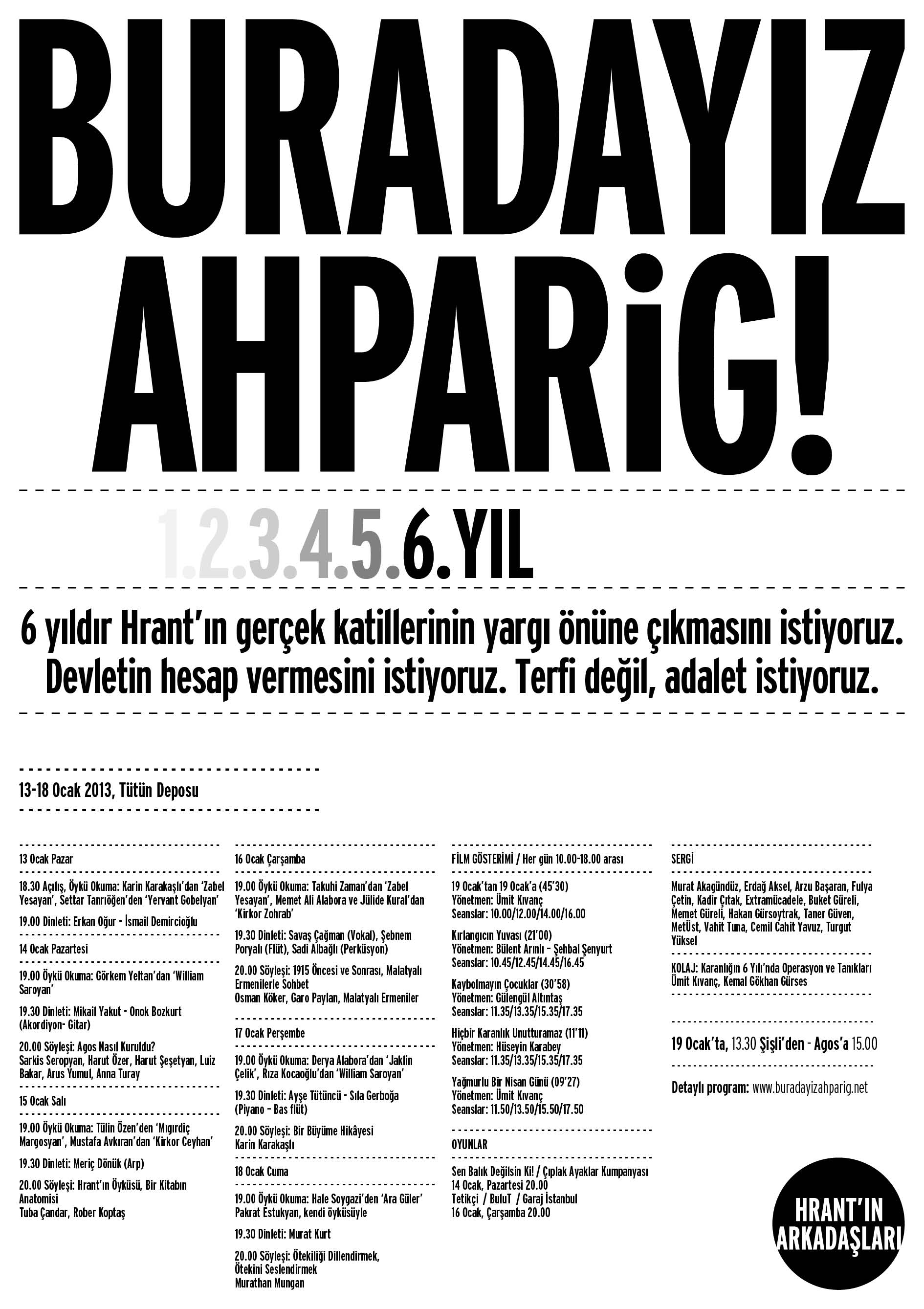 'Karanlığın 6. yılındayız. Arkadaşımız, ahparaiğimiz Hrant'ın gerçek katilleri, onun ölüm emrini verenler hala yargılanmadı. Hatta tam tersine, el üstünde tutuldu, terfi ettirildi. Bizler katledilişinin 6. yılında Hrant Dink'i bir dizi etkinlikle anarken, adalet talebimizi bir kez daha haykırıyoruz. Hrant'ın öldürülmesini tasarlayan, örgütleyen, bu cinayete karışan devlet içindeki 'yapı'nın derhal yargı önüne çıkmasını istiyoruz'