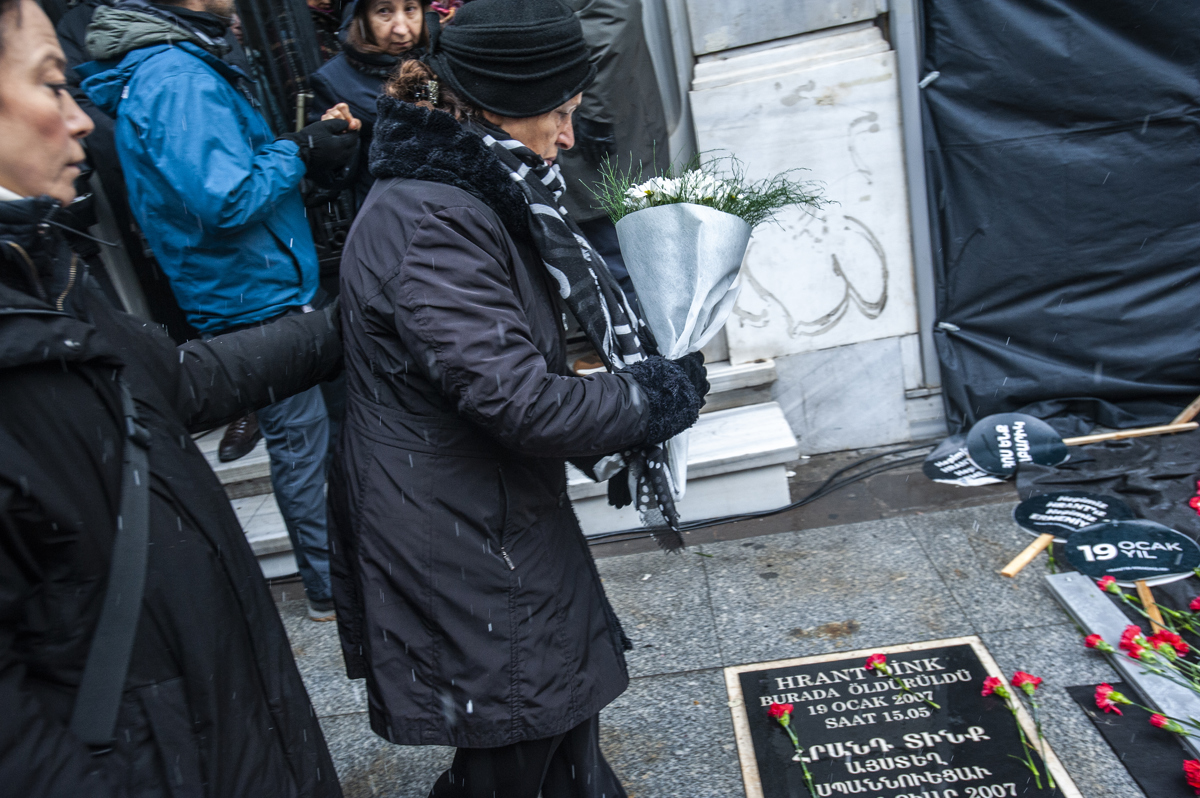 Gazetemizin kurucusu ve genel yayın yönetmeni Hrant Dink, her yıl olduğu gibi bu yıl da vurulduğu Sebat Apartmanı’nın önünde anılıyor. 14.30'da başlayan anma töreninde kar yağışına rağmen binlerce kişi Agos’un eski bürosunun önünde yerini aldı.