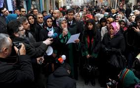 Hukukçular Derneği üyesi yaklaşık 100 avukat, İstanbul Barosunu başörtülü avukatların mesleklerini icra etmek için uyguladığı yasakları protesto etmek için Taksim Meydanı’nda toplandı. ‘Yasak değil hukuk üret’ , ‘Katil avukat olur, başörtülü olamaz’ , Baroya rağmen insan haklarını savunacağız’ , ‘Ey baro söyle, avukat için ne yaptın’ yazılı dövizler taşıyan avukatlar, İstiklal Caddesi üzerinden İstanbul Barosu’na kadar sesiz bir şekilde yürüdü.