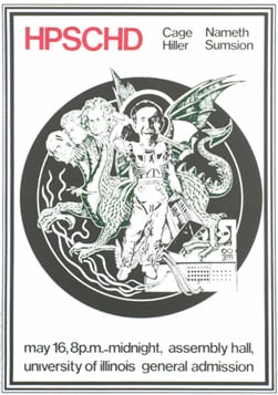 “I Ching” ile tanıştıktan 19 yıl sonra Illinois Universitesi’nde gösterir. HPSCHD isimli bu muazzam ölçekteki çoklu medya projesi 52 teyp, 7 klavsen, 52 hoparlör ve 60 adet projeksiyon makinesinden oluşmuştur. Mozart, Beethoven, Schumann’ın (sağdaki konser afişinde John Cage’in ejderhaların başları) müzikleri ve çeşitli seslerin karmaşık bir “rastlantısallaştırma” algoritması tarafından harmanlanmasıyla yaklaşık 8 saat süren bir performans ortaya çıkmıştır. Performans sırasında dinleyiciler, klasik konser salonu ortamına hapsedilmeyip, aksine gösteri merkezinin içinde ve hatta dışında gezinmeye teşvik edilmiştir. Böylece her dinleyici, sadece kendisine özgü bir HPSCHD deneyimi yaşamıştır.
