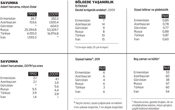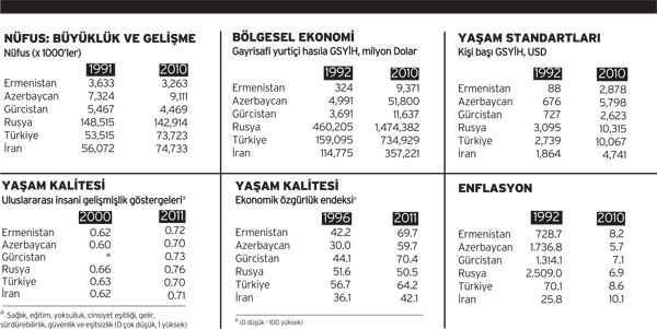 Merkezi Yerevan’da bulunan Civilitas Vakfı adlı sivil toplum kuruluşu, ‘Ermenistan ve Komşuları: Rakamlarla 20 Yıl’ başlıklı bir rapor yayımladı. Rapor tamamı ya da bir kısmı Kafkasya’da olan altı ülke, Ermenistan, Türkiye, Azerbaycan, Gürcistan, Rusya ve İran’ın Sovyetler Birliği’nin resmen dağıldığı 1991’den başlayarak 2011’e kadar olan ekonomik ve sosyal göstergelerini karşılaştırıyor. Raporda yer alan verileri dört uzman Agos okurları için değerlendirdi. Ermenistan’dan ekonomistler Aşot Yeğyazaryan ve Karlen Khaçatryan, Türkiye’de uluslararası ilişkiler uzmanları Gökhan Bacık ve Aybars Görgülü, raporda yer alan verilerden yola çıkarak Kafkasya’nın dünü, bugünü ve geleceğini yorumladılar.