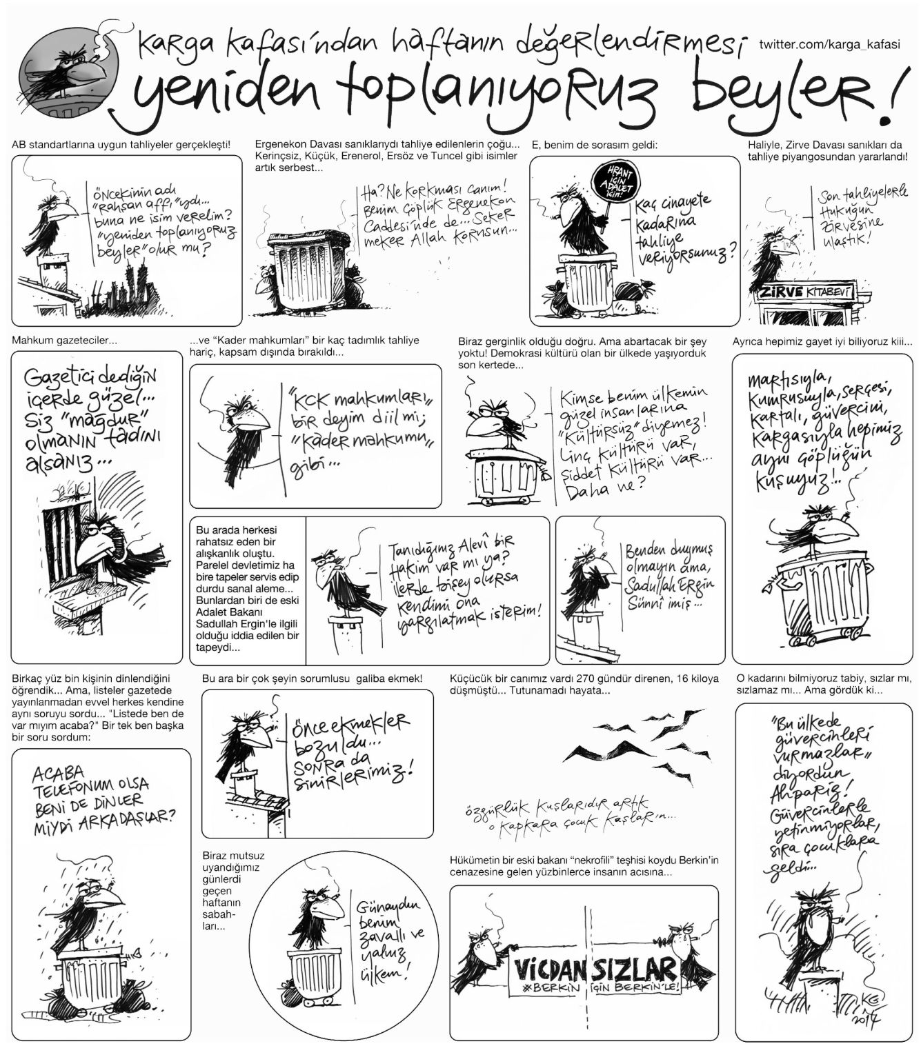 Son günlerde sosyal medyada yaptığı kuş uçuşu tespitlerle dikkat çeken ‘Karga kafası’, Ergenekon tahliyelerinden tapelere, dinlemelerden Egemen Bağış’a, haftayı Agos’a değerlendirdi. Karga kafası, Berkin’le birlikte kanat da çırptı.