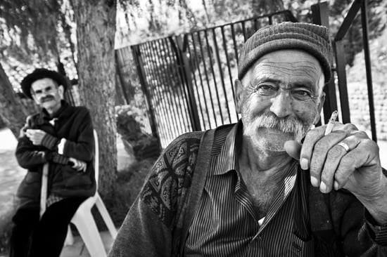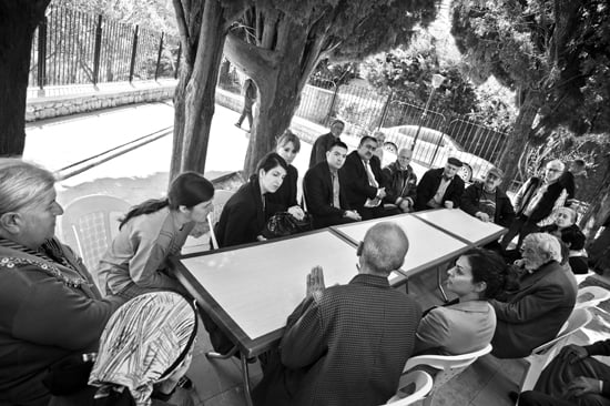 Beni ayağa kalkarak karşılayan hüzünlü beyefendi Marc Chagall’ın tablolarındaki ince uzun yüzlü, derin bakışlı erkekleri anımsatıyor. Movses Arabian ve kızkardeşi Marta Arabian, kışı Lazkiye’de yazı Kesab’da geçiren ve birlikte yaşayan iki kardeş. Sürgün yolunda kaybolan Marta Arabian’ın ilaçlarına muadil aranıyor. Başı döndüğü için elinde bir baston var sürekli. Bir ağaç dalını anımsatan o bastonu için “Kesab’dan getirdim. Yaslanıyorum ki burada düşmeyeyim” diyor. Dünyanın en güzel ifadelerinden birinin sahibi Movses Arabian ise “Ermenistan ve ABD’de akrabalarımız var. Beni bu saç sakalla görmelerini istemem” diyerek sadece arkadan fotoğraflanmayı kabul ediyor. İki kardeş de durumlarının ne olacağı belli olana kadar protesto olarak en eski kıyafetleri ile durmaya karar vermişler.