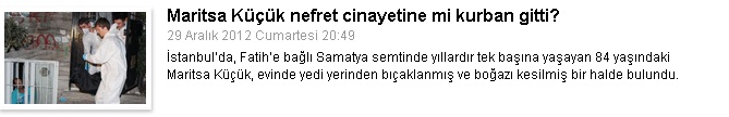Fatih’te geçen yıl Kasım ve Aralık aylarında, yalnız yaşayan 4 yaşlı kadın çeşitli zamanlarda saldırıya uğramış, bunlardan Maritsa Küçük (85), yaşamını yitirmişti. Olaylarla ilgili Ermeni asıllı Murat Nazaryan tutuklanmıştı.