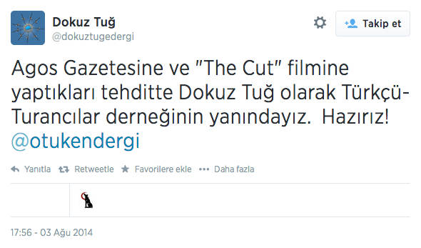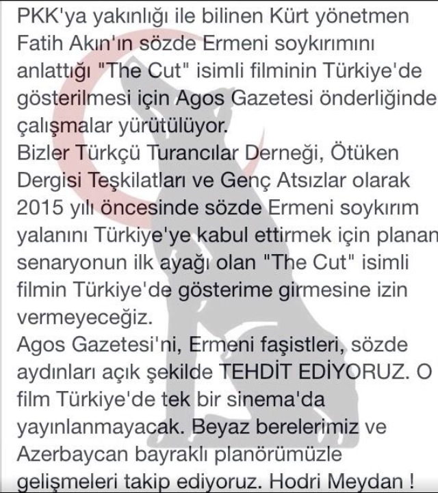 Türkçü Turancılar Derneği’ne ait ‘Ötüken Dergisi’, Agos Gazetesi’ni ve gazeteye söyleşi veren yönetmen Fatih Akın’ı twitter üzerinden açıkça tehdit etti.