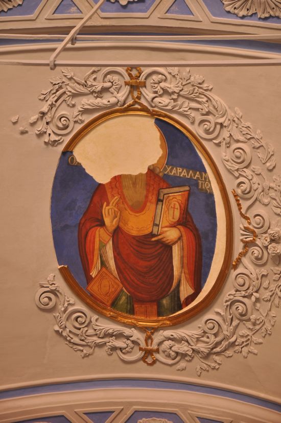 Buradaki bir başka fresk, kilisenin ithaf edildiği Aziz Haralambos’u göstermektedir. Tahrip olmuş başında hare bulunurken sağ eliyle teslis işareti yapmış olan Haralambos bir elinde de üzerinde haç motifinin bulunduğu İncil tutmaktadır.