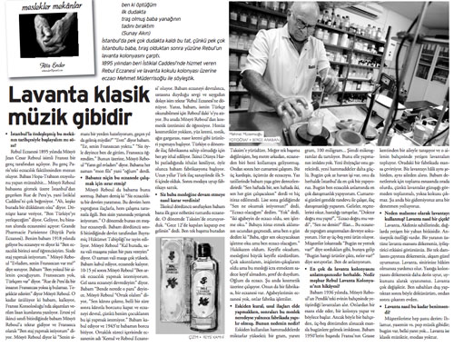 Babam 1936 yılında, Mösyö Reboul’un Pendik’teki evinin bahçesinde yetiştirdiği lavantaları alır. Onlardan bir esans elde eder, bir kolonya yapar ve böylece başlar. Ancak böyle bir bahçeden, üç-beş dönümden alınacak esansla bugünlere gelmek imkânsız. Babam 1950’lerin başında Fransa’nın Grasse kentinden bir aileyle tanışıyor ve o ailenin bahçesinde yetişen lavantaları topluyor. Oradaki bir fabrikada esansa çevirtiyor. Biz lavantayı hâlâ aynı şehirden, aynı aileden alırız. Babam denetlemek için toplama esnasında orada olurdu, çünkü lavantalar günışığı görmeden toplanmalı, yoksa kokusu çıkmaz. Şu anda biz gidemiyoruz ama bir denetmen yolluyoruz.