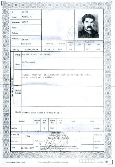 Siirtli Mehmet Emin Evin, özel mülkü olan arazide bulunan Süryani kilisesini satmak istiyor. Söz konusu araziyi, babasının hayvancılık yapmak üzere 1980’lerde Siirtli Araplardan aldığını belirten Evin, kilisenin de böylece kendi mülkiyetlerine geçmiş olduğunu anlatıyor. “1915’e kadar tüm bölge Hıristiyanlarındı sonra Müslümanların mülkiyetine geçti” diyen Evin, kendi ailesinin de aslen Keldani olduğunu fakat 1915’te zorla Müslüman yapıldığını ve Kürt gibi yaşamaya başladıklarını söylüyor.