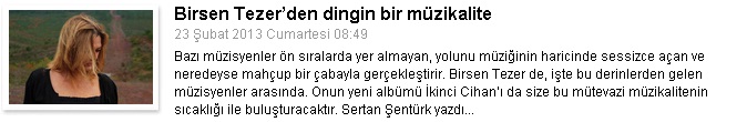 Birsen Tezer ‘İkinci Cihan’: Birsen Tezer geç tanışılan ama çabuk kaynaşılanlardan. Müziği de en parlak değil ama belki de bu sebeple en vurucusu. Parçaları bize masa başında geçen sıkıntılı saatlerde, acı ve keyifle tokuşturulan kadehlerde, konserlerinde kulağımıza eşlik ediyor; bazen de beklenmeyen bir anda, unutulamayanlar hatırlandığında çıkageliyor. Onun nağmeli anlatımı aslında hayatın süregelmesi ve bu sebeple de durmayan hayatımızın bir parçası. İkinci Cihan ise bitmeyen dertlerden, korkulan aşklardan, tüm “bu” koşturmalardan sıyrılma ve geride kalanlardan kusura bakmamasını dileyebilme arzusu: ve İkinci Cihan çalarken hayat bazen durabiliyor.