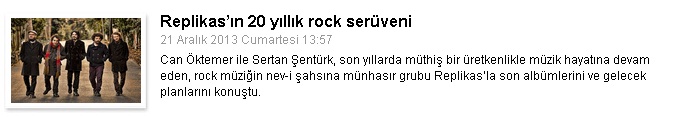 Replikas ‘EP No. 1’: Replikas 2012’nin sonunda Anadolu rocka ithafen Biz Burada Yok İken isimli cover albümünü çıkarmıştı. Bu albümden 3 ay gibi çok kısa bir süre sonra çok farklı bir anlatıma sahip EP No. 1’i kaydettiler. Üstelik bu enstrümantal albümün 32 dakika gibi nispeten kısa süresinin içine 7 memleket, dinledikçe eskimeyen hikayeler ve müzikalitelerinin derinliğini sığdırarak... Replikas EP No. 1 ile sadece yılın en çarpıcı albümlerinden birine imza atmadı; aynı zamanda özgün müziğin tekerrür etmeden nasıl sunulabildiğini bir daha gösterdi. Acaba EP No. 1’i tekrar tekrar dinlemek mi, yoksa grubun bir sonraki çalışmasını beklemek mi daha heyecanlı? Bilemiyoruz…