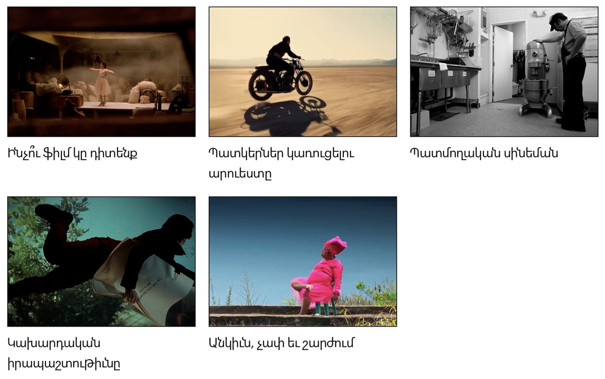 Հրայր Գալեմքէրեանի հեղինակութեամբ, Գալուստ Կիւլպէնկեան Հիմնարկութեան կողմէ 0ժանդակուած «Սինեմայի հարուստ աշխարհը» ծրագիրը հինգ տեսերիզներ կը հրամցնէ շարժանկարներու աշխարհէն։