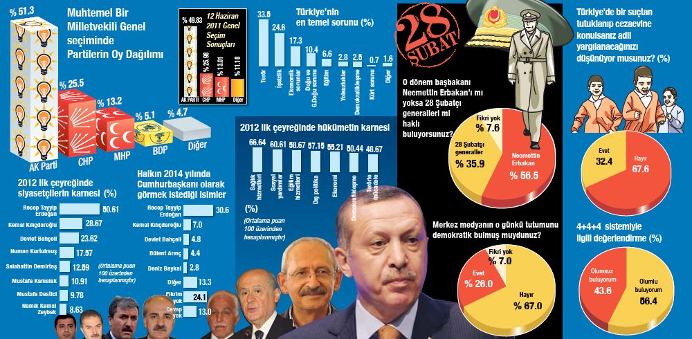 Sabah gazetesinin haberine göre; 100 üzerinden 50.61 puanla en başarılı lider seçilen Başbakan Tayyip Erdoğan'ı, araştırmaya katılanların yüzde 31'i 2014'te Cumhurbaşkanı olarak görmek istiyor. Okullarda Kürtçe'nin seçmeli ders olmasına katılımcıların yüzde 66.9'u 'Hayır' cevabını verdi.