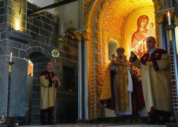 Diyarbakır’ın Sur ilçesinde, yıllar önce yaşanan çatışmalarda ağır hasar alarak harabeye dönen ve ardından yeniden ayağa kaldırılan kilisede yapılan ayini Başepiskopos Aram Ateşyan yönetti.