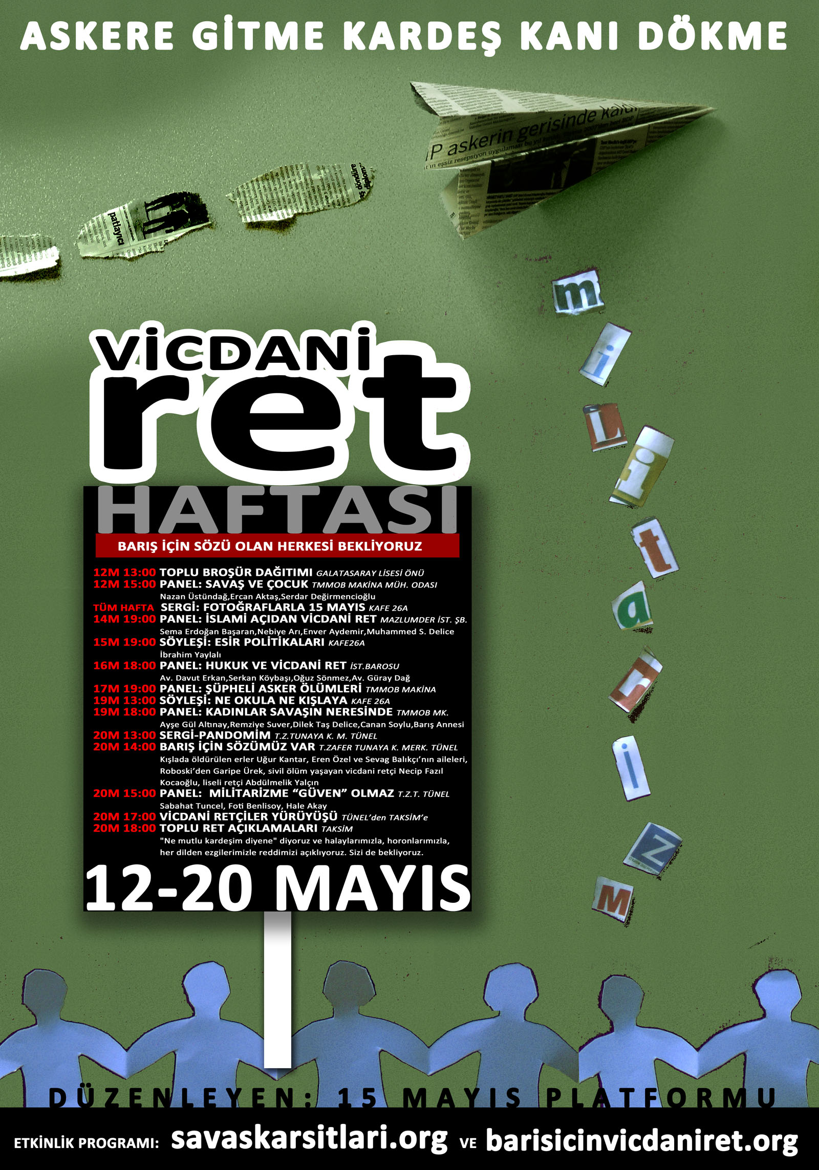 Savaş Karşıtları'nın Vicdani Ret Haftası duyurusunda, 'Bizler, vicdani retçiler, savaş karşıtları ve antimilitaristler olarak yaşanmakta olan savaşa ve militarizme karşı duruşumuzu, tavrımızı yapacağımız etkinliklerle dile getirip daha da geliştireceğiz. Bu yıl, 15 Mayıs Platformu olarak 9 güne yayılan etkinliklerle Dünya Vicdani Retçiler Günü'nü gerçekleştireceğiz' dendi.