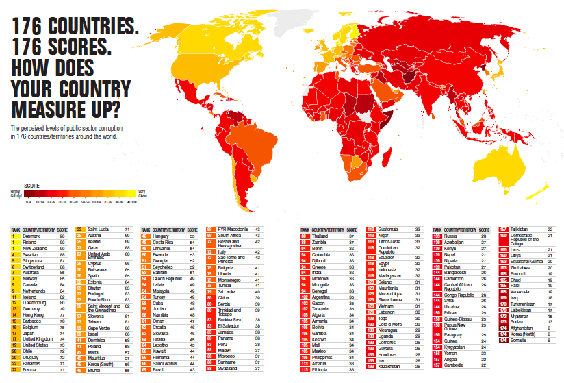0 ile 100 arası bir ölçekte puanlanan ülkelerin aldığı puan 0’a yaklaştıkça yolsuzluk algısının arttığı, 100’e yaklaştıkça ise yolsuzluk algısının düşük olduğu anlamına geliyor.
