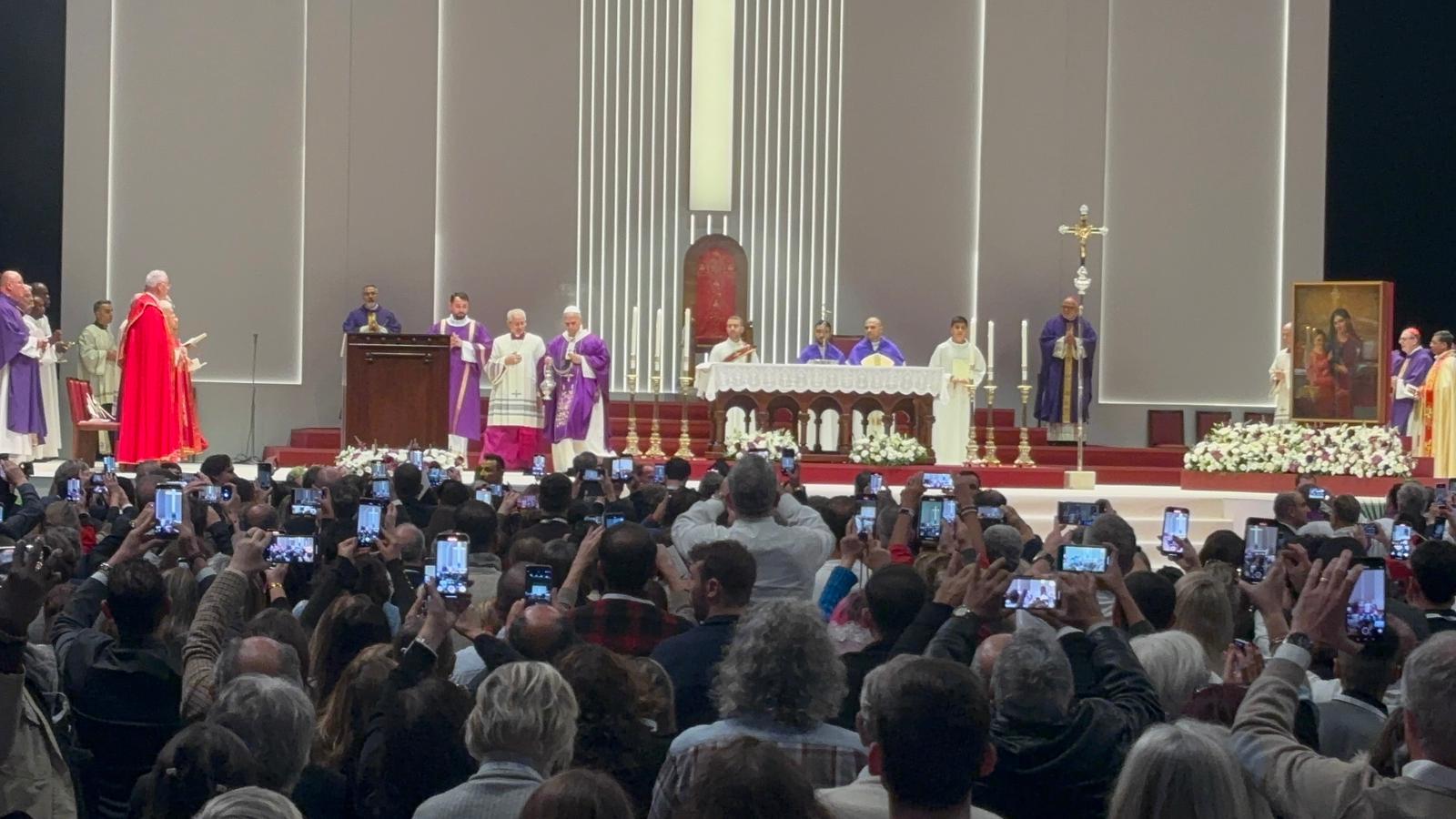 Salon dolmuştu ve kapılar kapanmıştı. Türkiye Ermenileri Patriği Sahak Maşalyan, İstanbul ve Ankara Süryani Ortodoks Cemaati Ruhani Lideri ve Patrik Vekili Mor Filüksinos Yusuf Çetin, Rum, Süryani, Ermeni ve Katolik ruhaniler de sunakta yerini aldı. Herkes ayağa kalkmış, büyük bir heyecan içerisinde Papa’yı bekliyordu. Kısa bir süre sonra koro ilahi seslendirmeye başladı ve Papa’nın da yer aldığı ruhani heyet tapor (resmi geçit) ile salonda yürümeye başladı. Sunağa doğru ilerleyen heyette, Latin Katolik, Keldani, Süryani ve Ermeni Katolik Patrikler ile ruhaniler, Papa’ya mumlarla eşlik etti. İncil’i Ermeni, haçı da Katolik bir ruhani taşıdı. Papa, taporda Ekümenik Patrik Bartholomeos ile birlikte yürüdü. Bu esnada alandaki binlerce kişi Papa’ya dokunmaya çalışıyor, coşkusunu “çok yaşa Papa” diyerek alkış ve zılgıtlarla yansıtıyordu.