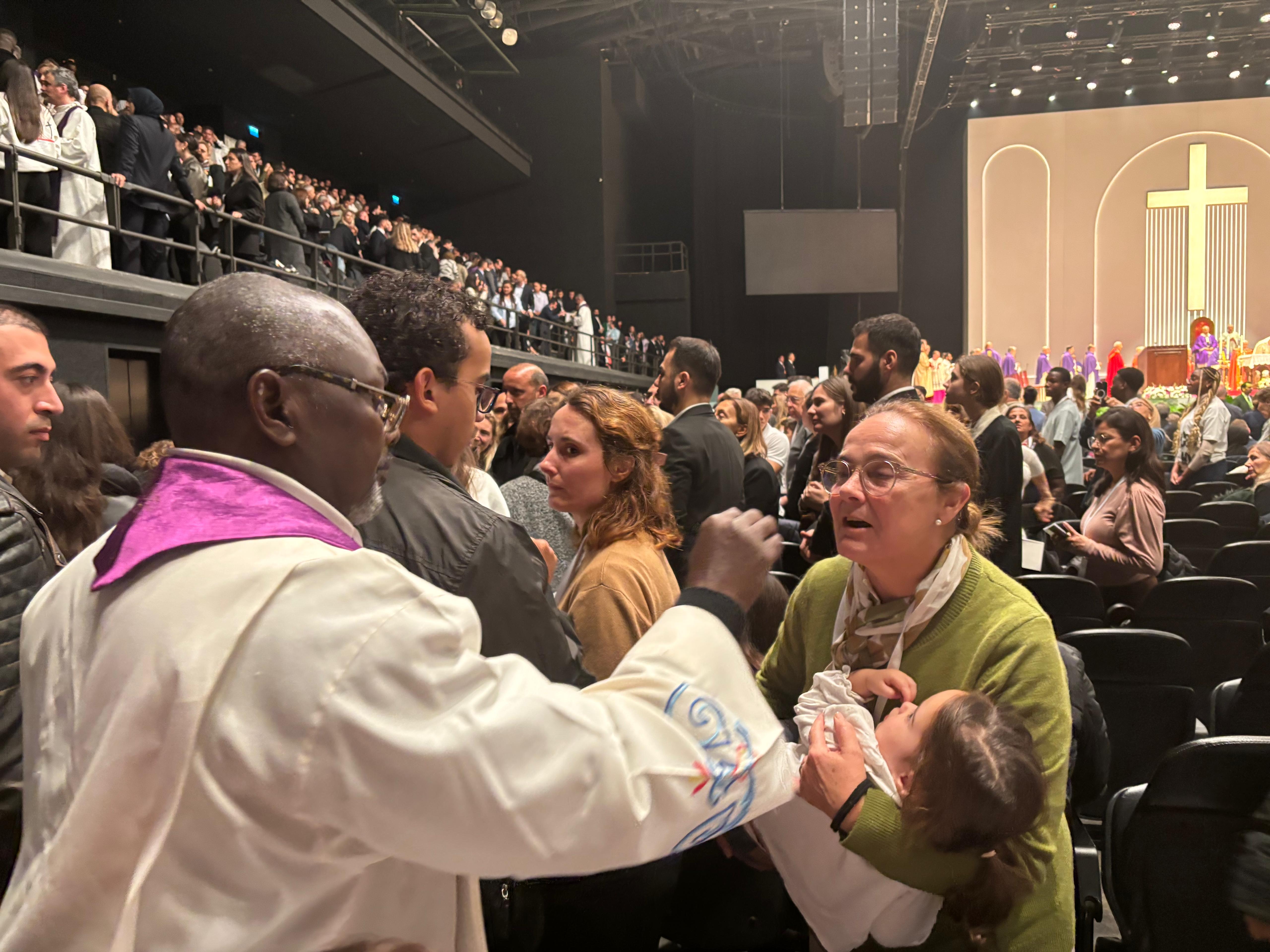 Ermeni, Süryani, Rum ve Latin Katolik ruhani liderler ve konuşma yapacak insanlar için sahnede sandalyeler bırakılmıştı. Ruhaniler ise litürjik kıyafetleriyle ayinde ilahi söylemek için sahnede yerini almıştı. Herkeste büyük bir heyecan vardı. Salona girenler, sahnenin hemen karşısında bir rahibe tarafından yönetilen evrensel koronun seslendirdiği Ermenice, Arapça, Süryanice ve İtalyanca ilahilerle büyüleniyordu. Bu ilahilerin çeşitliliği, ayine dair de bir ipucu veriyordu. 200 kişilik bu evrensel koroda ilahi söyleyenler, farklı renklerde şallar takmıştı. Turuncu Ermeni, sarı Keldani, kırmızı Süryani, yeşil renk şallar da Latin Katolik’lerdi. Ayrıca tüm oturaklara, “Kutsal Ayin, Noel’e Hazırlık Devresi, Birinci Pazar Günü” isimli ayin kitabı bırakılmıştı. Ayin akışına dair kitapta Ermenice, Süryanice, Arapça, Türkçe ve İtalyanca dillerinde bilgiler yer alıyordu. Böylelikle tüm ayin, kitaptan takip edilebildi.