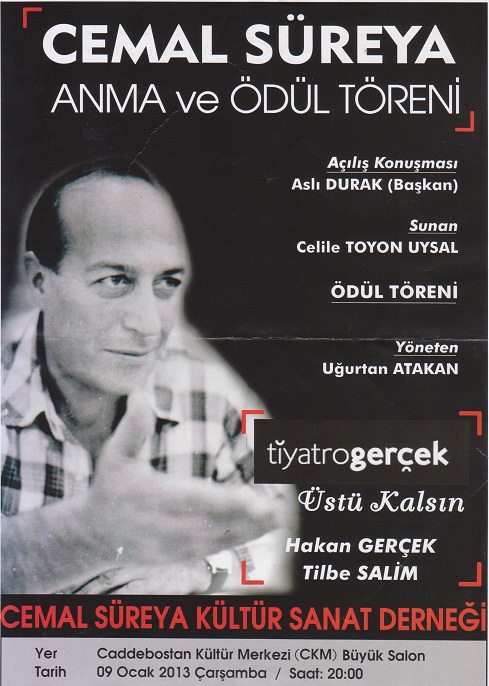 9 Ocak günü Cemal Süreya, “Üstü kalsın” deyip aramızdan ayrılalı 23 yıl oluyor. Bizler de 9 Ocak'ı içeren haftada, Türkiye'nin dört bir yanından Cemal Süreya'yı hayatında benimseyen, anmaya katılmak isteyen fakat İstanbul'da olmayıp katılamayanlar için bir program hazırlıyoruz. Gençlik Yönetimi olarak ilk defa düzenleyeceğimiz Cemal Süreya Haftası programını yakın zamanda sayfalarımızda duyuracağız. ([email protected] / twitter.com/csureyadernegi / cemalsureya.com.tr adreslerinden etkinlikleri takip edebilirler) Programa dahil etme çalışmalarını sürdürdüğümüz bazı şehirler Ankara, Eskişehir, Muğla, İzmir. Denizli, Muş, Mersin.